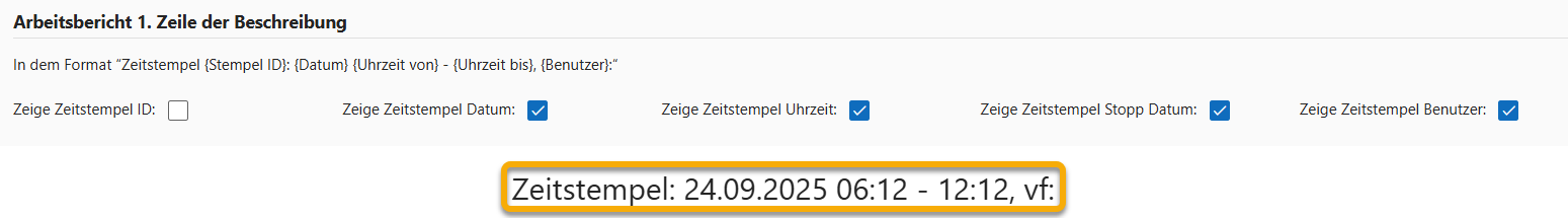 Erstellen Sie einen Zeitstempel, steht in der 1. Zeile der Beschreibung: Datum, Zeiten und Benutzerkürzel zu dieser Arbeitszeit. In dieser Einstellung können Sie über die Anklickboxen auswählen, welche Infos in der 1. Zeile steht. Unter der Überschrift steht die Reihenfolge, wenn alles aktiviert ist. Darunter können Sie auswählen, ob die Stempel ID, Datum, Uhrzeit, Stopp-Datum, das Benutzerkürzel angezeigt werden soll oder nicht.