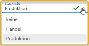 Ist in den Einstellungen der Haken bei „Produktion aktivieren“ gesetzt, erscheint noch eine Auswahlmöglichkeit „Produktion„. Dabei können Sie auch aus der Stückliste wählen.