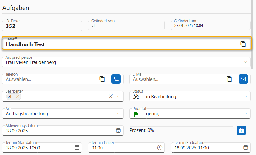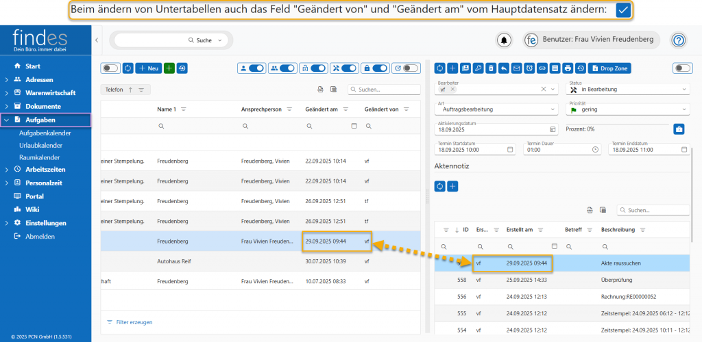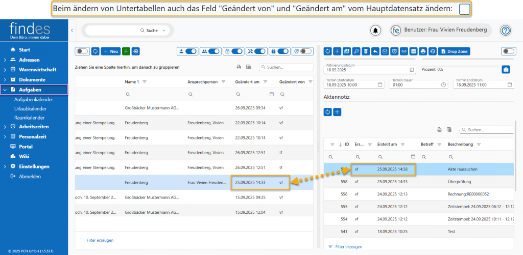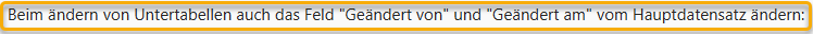 Ändern Sie einen Eintrag in der Untertabelle von z.B. dem Modul Aufgaben, werden nur dort die Felder „Geändert von“ und „Geändert am“ geändert. Ist der Haken gesetzt ändern sich auch die Felder „Geändert von“ und „Geändert am“ im Hauptdatensatz.