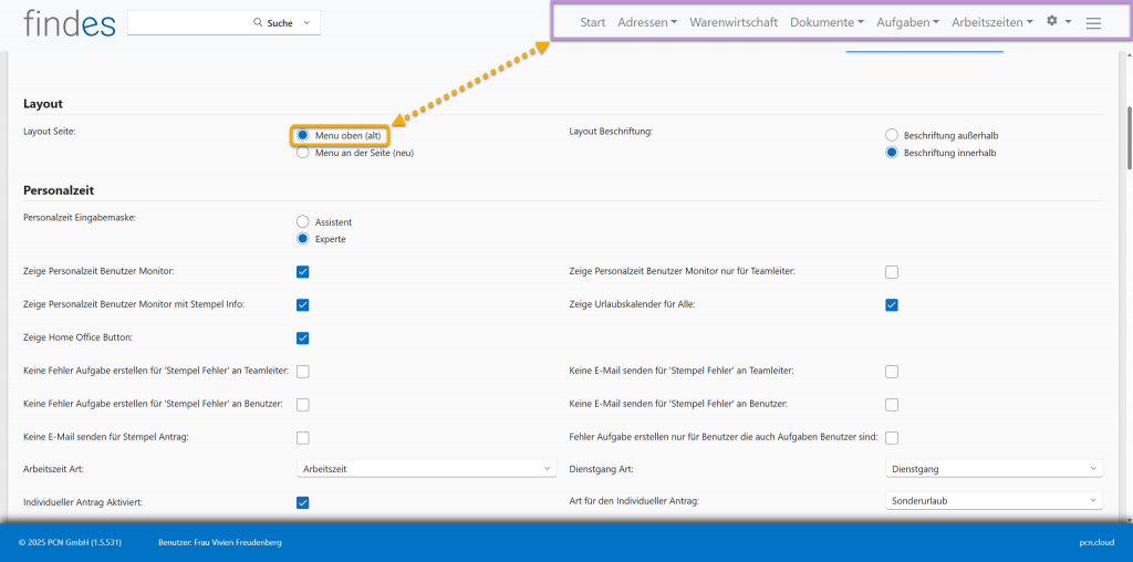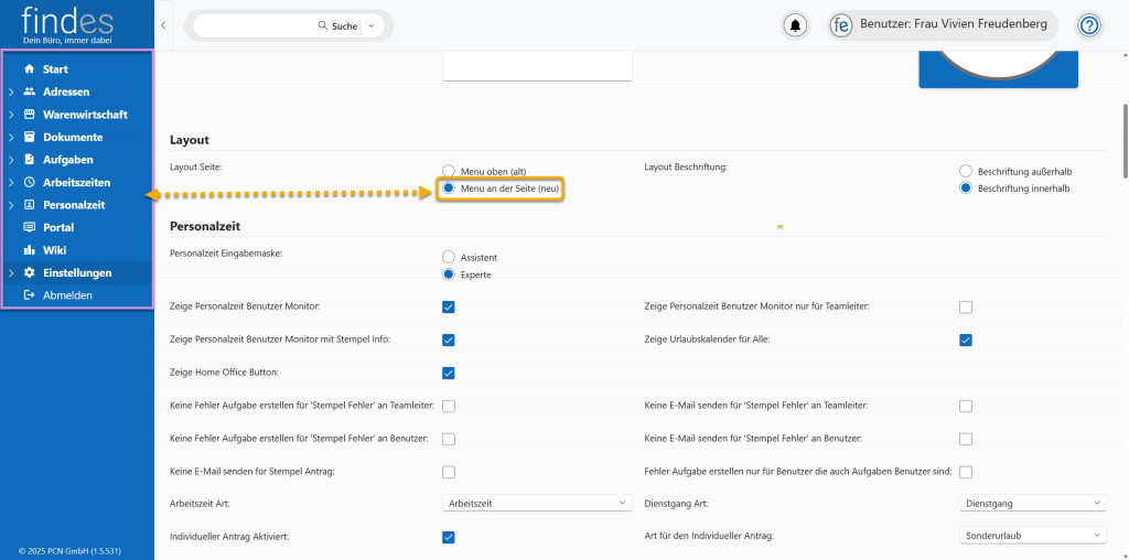 Unter dem Punkt „Layout Seite“ können Sie durch Anklicken auswählen, ob das findes Menü oben im Browserfenster erscheint (altes Layout) oder links an der Seite (neues Layout). Nach dem Ändern scrollen Sie runter und klicken auf Speichern und Melden sich aus findes ab und wieder an, um die Änderungen zu übernehmen.