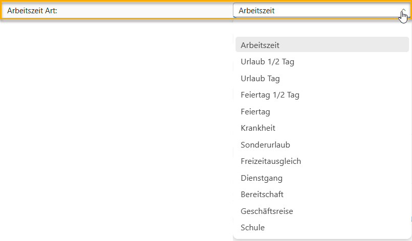 Wählen Sie durch Anklicken der Dropdown-Liste die Standard Arbeitszeit Art aus. Automatisch ist Arbeitszeit (08:00 Arbeitszeitstunden) ausgewählt. Haben Sie eine andere Arbeitszeit Art als Standard wählen Sie diese über die Dropdown-Liste aus.