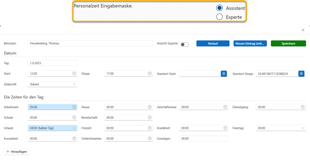 Unter dem Punkt „Personalzeit Eingabemaske“ geben Sie an in welcher Ansicht Sie im Modul Personalzeit die Bearbeitungsmaske dargestellt haben möchten. In der Assistent-Ansicht können Sie nur die Gesamtzeit des Tages sehen. In der Experten-Ansicht können Sie die Uhrzeiten genauer einstellen.