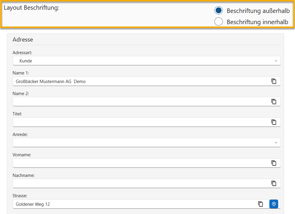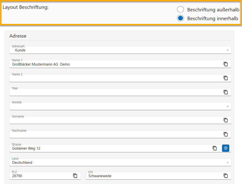 Unter dem Punkt „Layout Beschriftung“ können Sie durch Anklicken auswählen, ob die Beschriftung innerhalb oder außerhalb der Textfelder liegen. Nach dem Ändern scrollen Sie runter und klicken auf Speichern und Melden sich aus findes ab und wieder an, um die Änderungen zu übernehmen.