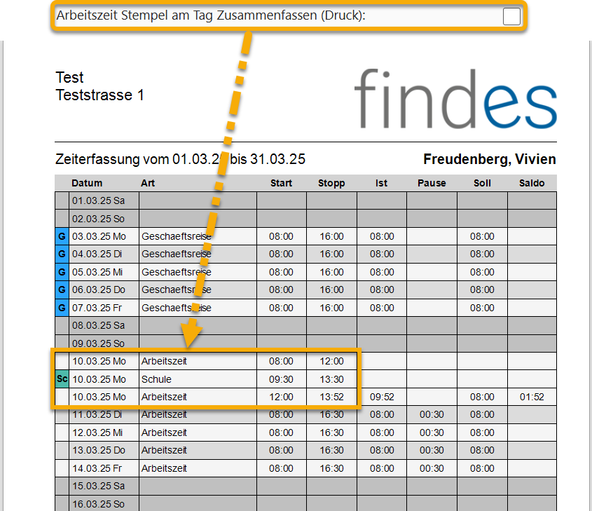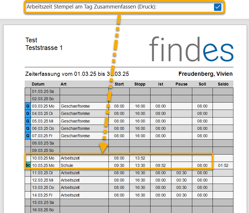 Ist dieser Haken gesetzt, werden alle gestempelten Arbeitszeiten eines Benutzers, von einem Tag in der Druckansicht von „Personal Abrechnung“ als eine Zeit zusammengerechnet. Ist der Haken nicht gesetzt, stehen die einzelnen Arbeitszeiten eines Tages untereinander.