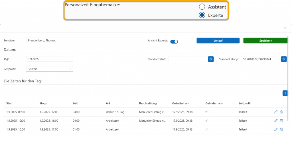 Beispiel: Haben Sie einen halben Tag gearbeitet und einen halben Tag Urlaub (Arbeitszeit 08:00-16:00Uhr), dann ist automatisch von 08:00-12:00 Uhr Arbeitszeit und von 12:00-16:00 Uhr der halbe Tag Urlaub. Haben Sie an diesem Tag vormittags den halben Tag Urlaub genommen und um 12:00 Uhr angefangen zu arbeiten, können Sie dies über die Experten-Ansicht bearbeiten. Nach dem Ändern scrollen Sie runter und klicken auf Speichern und Melden sich aus findes ab und wieder an, um die Änderungen zu übernehmen.