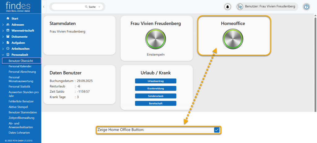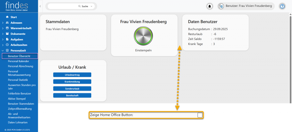 Durch Auswählen der Anklickbox, können Sie im Modul Personalzeit unter „Benutzer Übersicht“ den Homeoffice Button ein- oder ausblenden lassen. Wofür der Homeoffice Button benutzt wird, erfahren Sie hier.