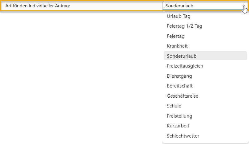 Automatisch ist Sonderurlaub ausgewählt. In den Einstellungen rechts neben der Anklickbox können Sie die Art des individuellen Antrags in der Dropdown-Liste auswählen.