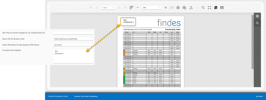 In den darunterliegenden Feldern geben Sie einmal den UNC-Pfad für den Server ein, den Sie z.B. für den Check-in / Check Out im Modul DMS verwenden. In das Feld für die „Server URL“ geben Sie die Server URL für den Browser Link ein. Darunter tragen Sie den DNS-Namen ein, über die die findes App angesprochen wird. In das große Textfeld tragen Sie die Adresse ein, die im Kopftext von findes Formularen steht, z.B. im PDF-Formular der Personal Abrechnung.