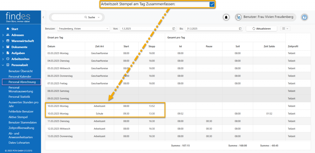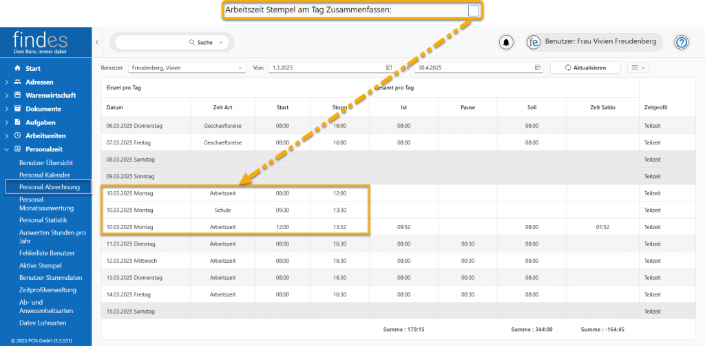 Ist dieser Haken gesetzt, werden alle gestempelten Arbeitszeiten eines Benutzers, von einem Tag in der Tabelle „Personal Abrechnung“ im Modul Personalzeit als eine Zeit zusammengerechnet. Ist der Haken nicht gesetzt, stehen die einzelnen Arbeitszeiten eines Tages untereinander.