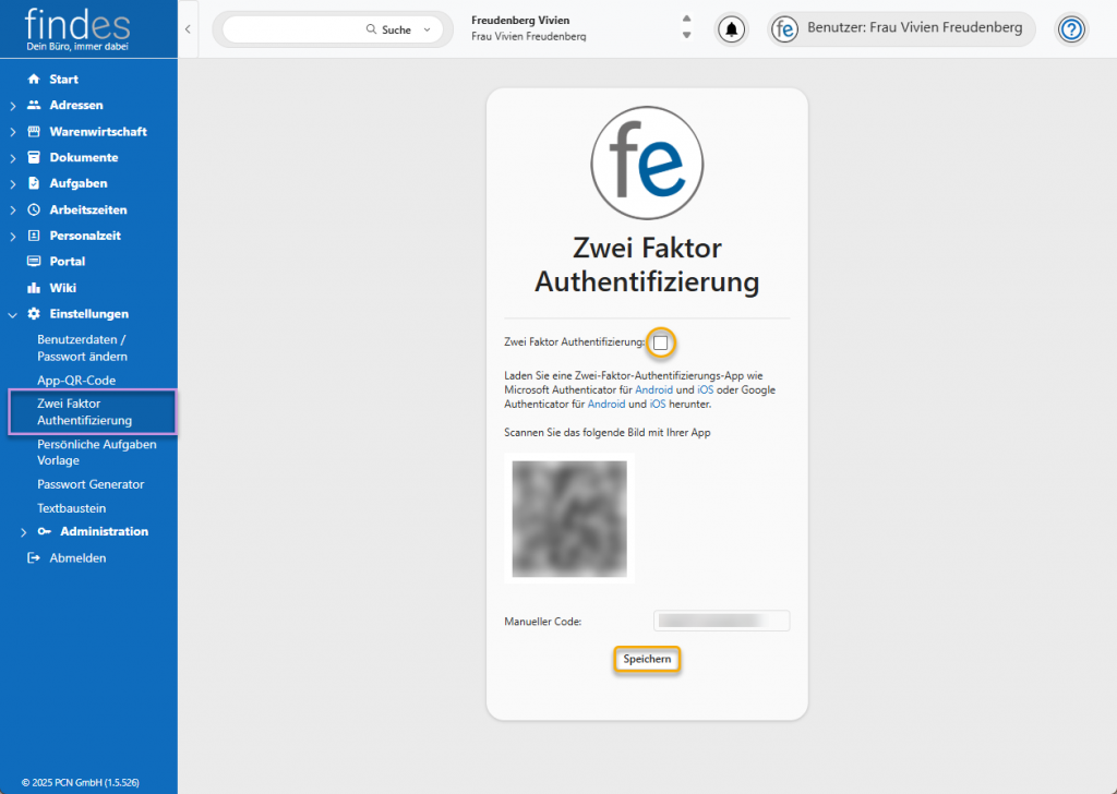 Aktivieren Sie die Zwei-Faktor-Authentifizierung für Ihr individuelles findes. Setzen Sie zunächst den Haken, um die Zwei-Faktor-Authentifizierung bei der Anmeldung zu aktivieren. Laden Sie eine Zwei-Faktor-Authentifizierungs-App in Ihrem Google Play Store oder App Store herunter. Beispiele hierfür sind der Microsoft Authenticator oder Google Authenticator. Scannen Sie in Ihrer Authenticator App den QR-Code oder geben den Code unten manuell ein. Hat das Synchronisieren funktioniert, klicken Sie unten auf Speichern, um die Zwei-Faktor-Authentifizierung zu aktivieren.
