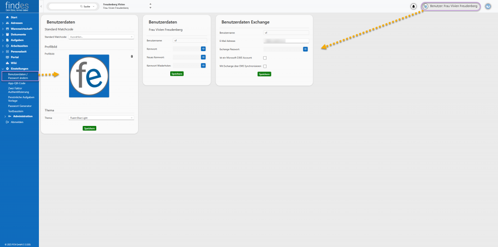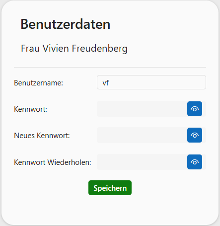 Im zweiten Fenster steht Ihr Benutzername und Adresse, die mit diesem Profil verknüpft ist. Haben Sie im Adressmodul keine Adresse eingetragen, steht hier nur der Name. Darunter steht Ihr Benutzername, mit dem Sie sich bei findes anmelden, genauso wie das Kennwort. Mit einem Klick auf das Augen-Icon erscheint das Kennwort in Klarbuchstaben. Ändern Sie in den folgenden zwei Feldern Ihr Kennwort. Klicken Sie anschließend auf Speichern.