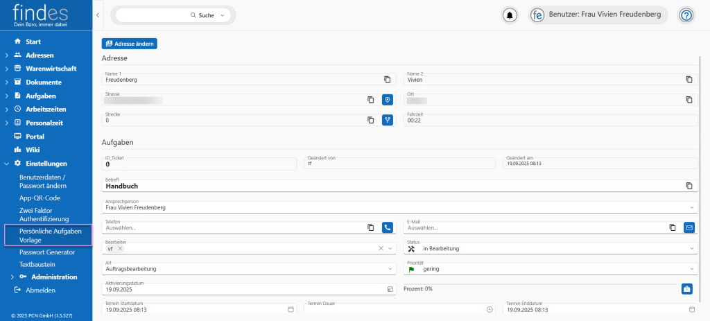Eine neue Aufgabe wird erstellt. Im Betreff steht das, was Sie in das kleine Fenster eingetragen haben, genauso wie in der Aktennotiz. In der Adresse stehen Ihre Angaben, genauso wie in den Aufgabendetails. Mit dieser Vorlage müssen Sie nicht jedes Mal die Adressangaben und Aufgabendetails neu eintragen. Diese Angaben können Sie im Modul Einstellungen unter dem Punkt „Persönliche Aufgaben Vorlage“ einstellen.