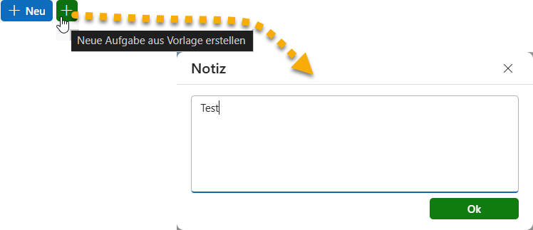 Wollen Sie im Modul Aufgaben eine neue Aufgabe erstellen, dann können Sie das einmal über das blaue Plus machen oder über das grüne Plus. Dabei öffnet sich nur ein kleines Text Fenster, in das Sie eine kurze Notiz zur Aufgabe reinschreiben. Klicken Sie unten rechts auf Ok.