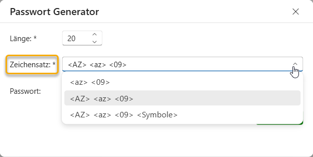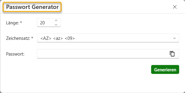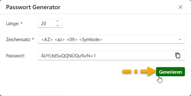 Klicken Sie anschließend unten rechts auf Generieren. In dem Feld „Passwort“ erscheint das generierte Passwort. Klicken Sie in dem Feld auf das Kopier-Icon um, dass Passwort zu kopieren und verwenden. Klicken Sie oben rechts auf das X, um dem Passwort Generator zu schließen. Die generierten Passwärter werden in findes nicht automatisch gespeichert.