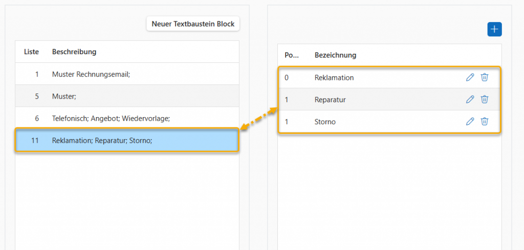 In der dritten Tabelle stehen die Textbausteine. Mit einem Klick auf das Stift-Icon öffnet sich ein Fenster, mit dem Inhalt des Textbausteins.