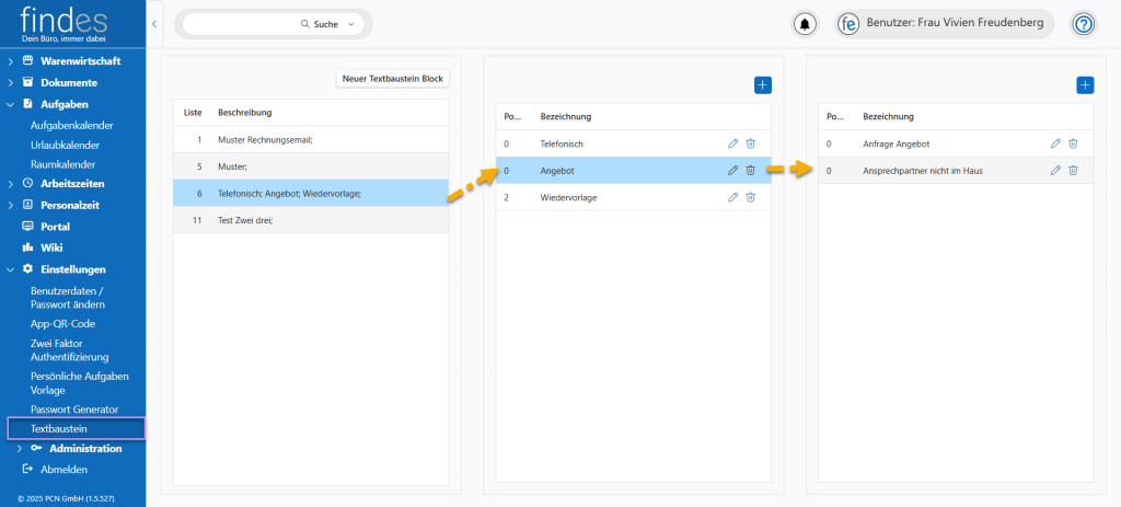 In der zweiten Tabelle stehen die Oberkategorien der Textbausteine. Klicken Sie auf einen und in der dritten Tabelle erscheinen die Textbausteine.