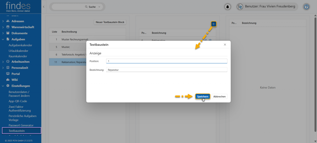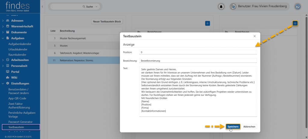 Bearbeiten Sie einen Textbausteintext. Es öffnet sich ein kleines Fenster, in dem Sie die Position, Bezeichnung und den Text bearbeiten können. Klicken Sie anschließend auf Speichern. Möchten Sie die Änderungen nicht übernehmen, klicken Sie unten rechts auf Abbrechen.
