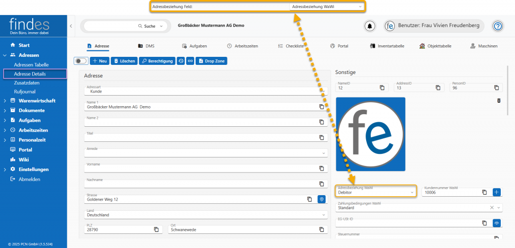 Wählen Sie über die Dropdown-Liste aus, aus welchem Adressfeld die Adressbeziehung (Kreditor oder Debitor) für das Modul Warenwirtschaft ausgelesen wird.