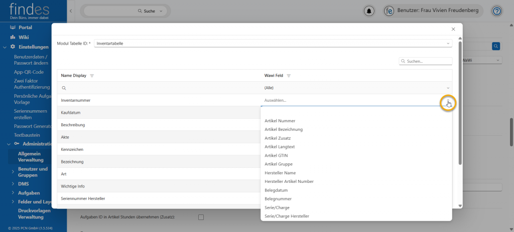 Links in der Tabelle stehen die Felder, die in den Zusatztabellen eingefügt wurden und rechts können Sie das entsprechende Wawi Artikelfeld hinzufügen.