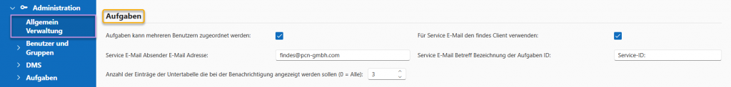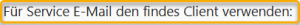 Ist der Haken gesetzt werden für Service E-Mails, wie z.B. Aufgabenbenachrichtigungen, über den findes Client versendet. Über das Feld „Service-E-Mail Absender-E-Mail-Adresse“ tragen Sie die Mail ein, über die die Service Mails versendet werden sollen.