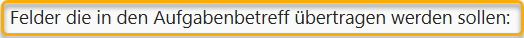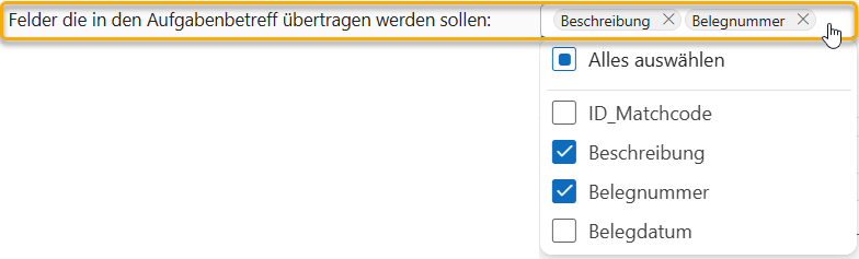 Wählen Sie über das Dropdown Fenster aus, welche Felder, z.B.: Beschreibung, Belegnummer, in das Feld Betreff bei einer Aufgabenerstellung zu einem Dokument, z.B. Dokument konnte nicht abgelegt werden, angezeigt werden soll.
