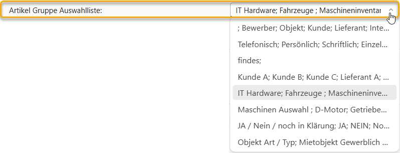 Wählen Sie über die Dropdown-Liste aus welcher Liste an Artikelgruppen beim Erstellen oder Bearbeiten eines neuen Artikels auswählbar sind.