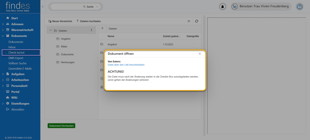 Ist der Haken gesetzt, erscheint beim DMS-Check-out das Hinweisfenster. In diesem steht zum Einem, dass man die Datei über den Link herunterladen kann, wenn man ein externer Benutzer ist. Zum anderen steht dort der Hinweis, dass man das Dokument nach dem Bearbeiten wieder einchecken muss. Ist der Haken nicht gesetzt, erscheint dieses Hinweisfenster nicht.
