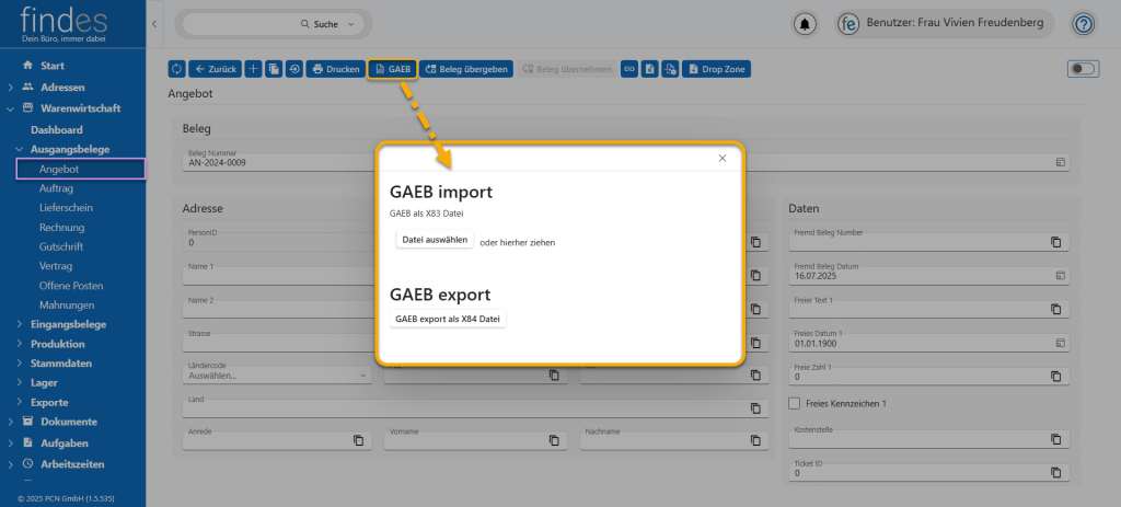 Ist dieser Haken gesetzt, können Sie GAEB-Dateien in findes hochladen. Unter dem Modul Warenwirtschaft in Ausgangsbelege „Angebot“, können Sie ein neues Angebot erstellen und in den Angebotsdetails oben erscheint ein neuer blauer Button in der Liste. Klicken Sie diesen an und ein kleines Fenster öffnet sich. Klicken Sie auf Datei auswählen oder ziehen Sie die entsprechende X83 Datei in das Feld hinein. Die Daten werden in findes hochgeladen und Sie können Ihr Angebot erstellen. Soll die Datei exportiert werden, um Sie an den Ausschreibenden zurückzuschicken, klicken Sie wieder auf den blauen Button und wählen im Fenster „GAEB Export als X84 Datei„.