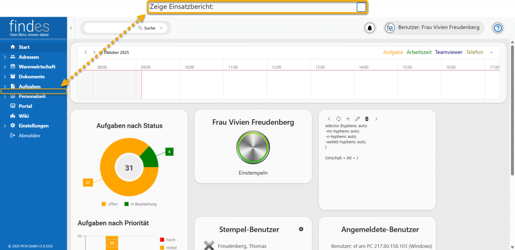 Tragen Sie den Benutzernamen ein, den man z.B. im Modul Aufgaben in dem Feld „Bearbeiter“ sieht. Sie können den Namen ausschreiben oder nur die Initialen eintragen.