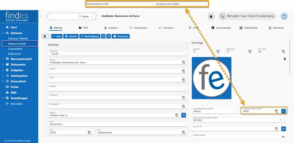 Wählen Sie über die Dropdown-Liste aus, aus welchem Adressfeld die Kundennummer in den jeweiligen Wawi-Beleg verwendet wird.