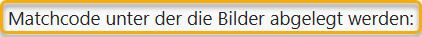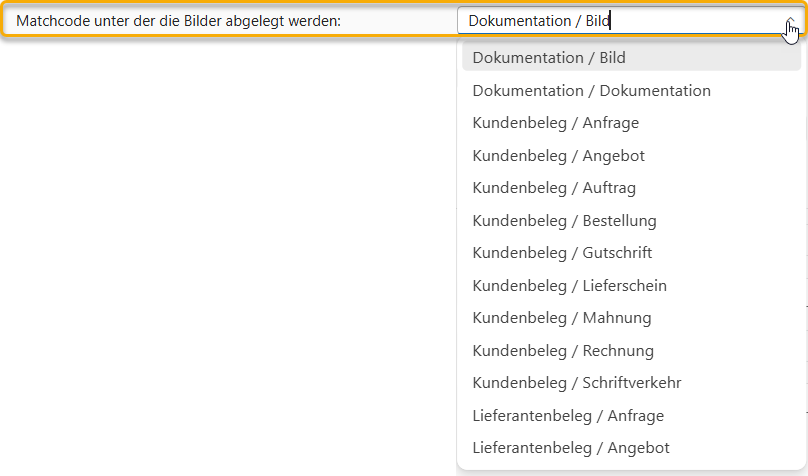 Wählen Sie in der Dropdown-Liste aus, unter welchem Matchcode Bilder abgelegt werden sollen. Automatisch ist der Matchcode „Dokumentation/Bilder“ ausgewählt.