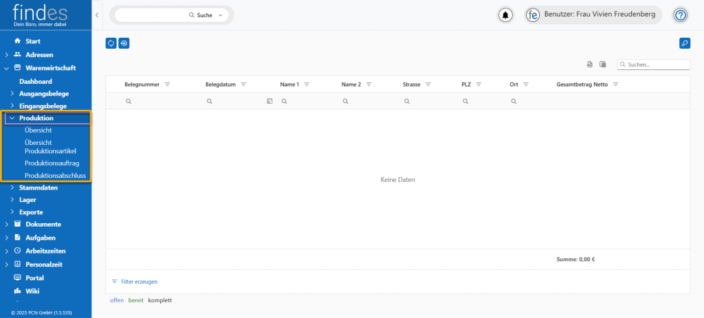 Ist in den Einstellungen der Haken bei „Produktion aktivieren“ gesetzt, erscheint noch eine Auswahlmöglichkeit „Produktion„. Dabei können Sie auch aus der Stückliste wählen.
