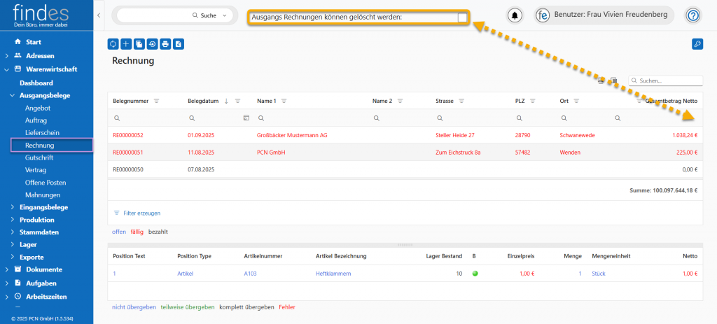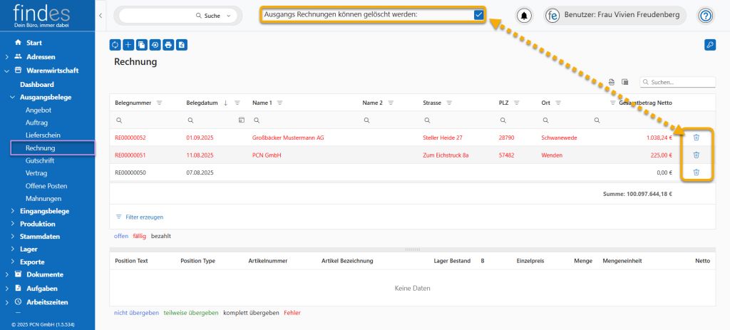 Ist dieser Haken gesetzt, können Rechnungen aus dem Bereich Ausgangsbelege gelöscht werden.