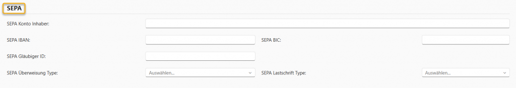 Tragen Sie in die folgenden Felder die Bankverbindung Ihres Unternehmens, für den SEPA-Import und Export im Modul Warenwirtschaft ein. Wählen Sie ebenfalls durch Anklicken der Dropdown-Liste den SEPA Überweisungs-Type und den SEPA Lastschrift Type aus.