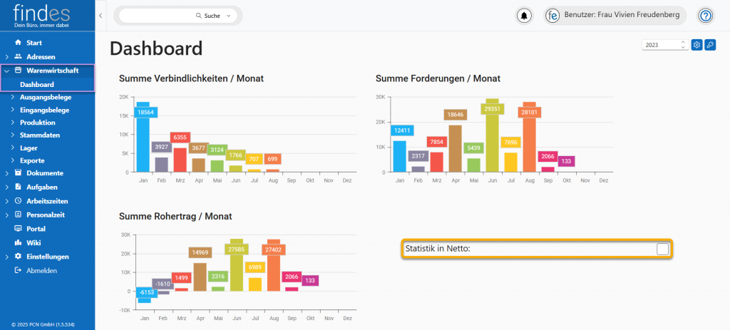 Durch Auswählen der Anklickbox, wird im Dashboard Warenwirtschaft die Netto-Angaben in der Tabelle dargestellt.