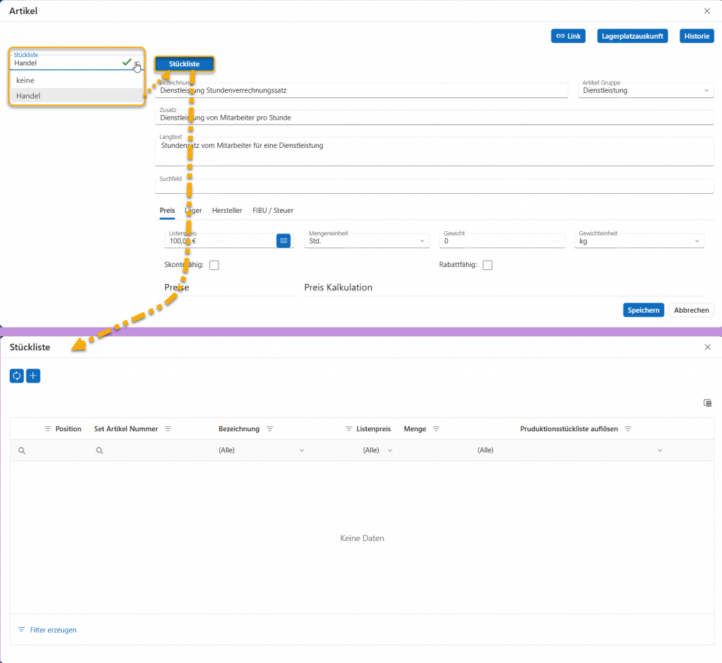 Ist der Haken gesetzt, erscheint in den Artikeldetails links über dem Feld „Nummer“ ein Dropdown-Feld, in dem Sie auswählen können, ob es sich bei der Stückliste um einen Handelsartikel handelt. Ist dieser Punkt ausgewählt, erscheint daneben ein neuer Button. Klicken Sie diesen an, öffnet sich ein neues Fenster mit den Stücklisten. Wählen Sie den entsprechenden durch einen Doppelklick aus.