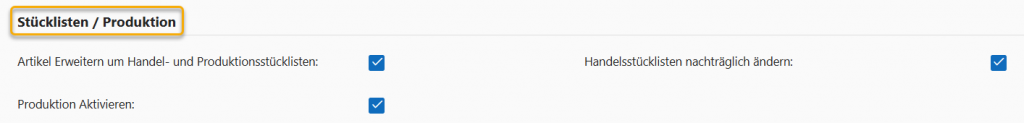 Produzieren Sie in Ihrem Unternehmen eigene Waren, können Sie durch setzen des Hakens, im Modul Warenwirtschaft den Unterpunkt „Produktion“ freischalten. Scrollen Sie runter und klicken unten rechts auf Speichern, um die Änderung zu übernehmen.