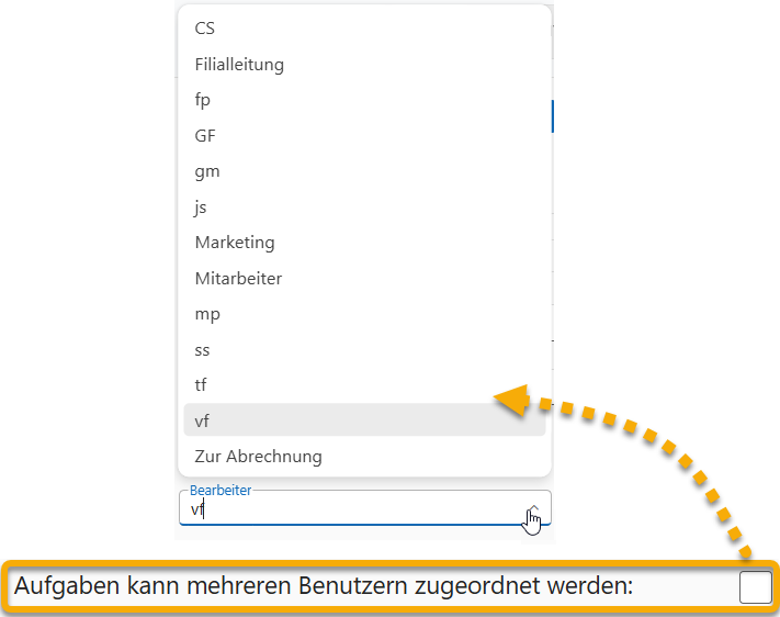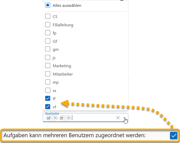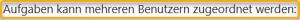 Ist der Haken gesetzt, können für eine Aufgabe mehrere Benutzer und Gruppen zugeordnet werden. Ist der Haken nicht gesetzt, kann nur ein Benutzer oder eine Gruppe ausgewählt werden.